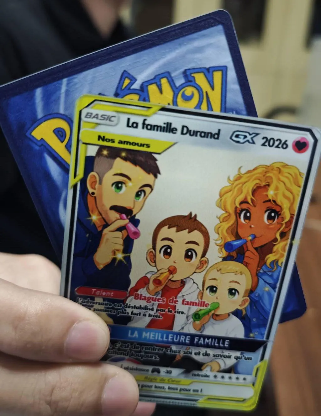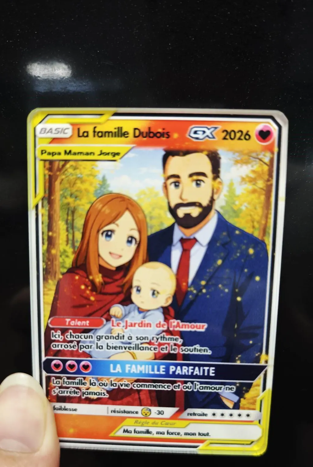 Achat d'une carte personnalisée style pokemon. Contente du résultat ! L'équipe est très à l'écoute et cherche réellement à nous satisfaire. J'ai même été contacté dès le jour de ma commande pour me signaler que ma photo sortait un peu du cadre et qu'il s'était permis de la modifier pour qu il n'y ait aucune zone blanche et savoir si ça pouvait me convenir. Ils ont à coeur le travail bien fait. La préparation et l'envoi ont été rapide. Je les remercie.